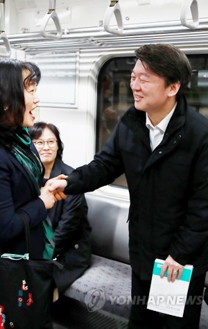 국민의당 대선후보인 안철수 전 대표가 5일 오전 서울 노원구 지하철 7호선 수락산역에서 태릉입구역까지 열차를 타고 이동 중 한 시민으로부터 후보 선출 축하 인사를 받고 있다.