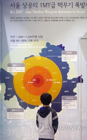 5일 용산 전쟁기념관에 서울 상공 핵무기 폭발 피해 가상도가 전시돼 있다. 이날 북한은 동해상으로 중장거리탄도미사일(IRBM) '북극성 2형'으로 추정되는 탄도미사일 1발을 발사했다.