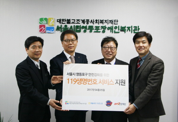 최근 서울 영등포소방서와 NH투자증권이 함께 서울시립영등포장애인복지관에 '119생명번호 팔지' 200개를 전달했다. 사진은 119안전재단 홍보대사인 이재용 아나운서(오른쪽) 등의 관계자들이 기념촬영을 하는 모습.(사진제공=영등포소방서)