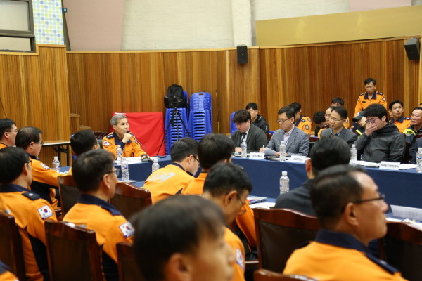 서울 강남소방서는 최근 소방서 강당에서 지난 3월29일 오전 8시50분경 발생한 ‘구룡마을 화재’에 대한 화재방어검토회의를 실시했다. 사진은 김시철 서장(가운데)이 발언하는 모습.(사진제공=강남소방서)