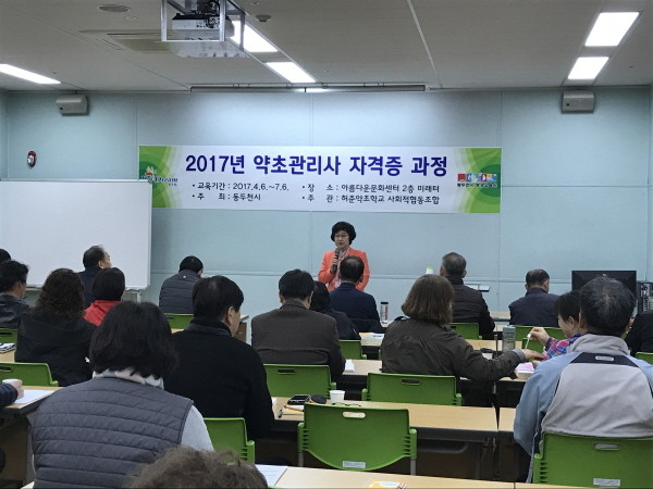 경기 동두천시는 지난 6일 아름다운문화센터 2층 미래터에서 약초관리사 자격증 과정을 개강했다. 사진은 개강식에서 약초와 건강에 관해 한약사의 강의가 진행 중인 모습.(사진제공=동두천시청)