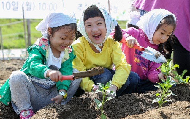 10일 오전 서울 광진구 중랑천 둔치에서 열린 '자투리텃밭 가꾸기 행사'를 찾은 관내 어린이집 원생들이 모종을 심고 있다. 광진구는 1천800㎡ 규모의 중랑천 유휴공간을 활용해 총 120구획으로 나누어 텃밭을 운영하며 분양 참가자들이 농사를 쉽게 지을 수 있도록 교육 및 농기구 대여 등을 지원한다.