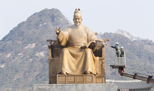 10일 오전 서울 광화문 세종대왕상에서 서울시 관계자들이 세종대왕상을 세척하고 있다.