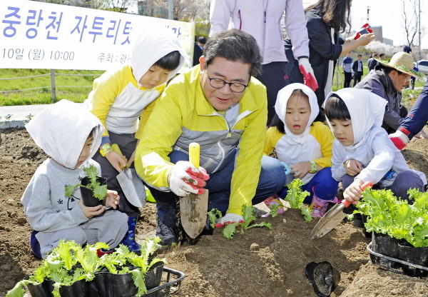 광진구는 지난 10일 오전 10시부터 군자교에서 장평교에 이르는 중랑천 둔치에서 ‘자투리텃밭 가꾸기’ 행사를 개최했다. 사진은 행사에 참여한 김기동 구청장이 어린이들과 함께 모종을 심는 모습.(사진제공=광진구청)