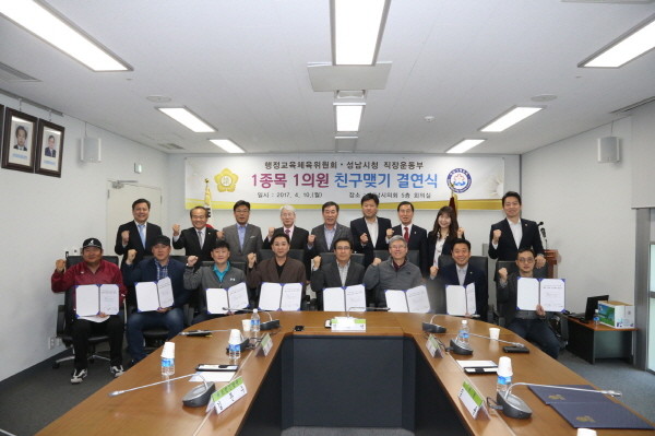 지난 10일 시의회 회의실에서 열린 결연식에는 시의원들과 성남시청 직장운동부 태권도, 복싱, 펜싱, 하키, 테니스, 빙상, 육상, 배드민턴, 볼링 등 9개 종목 감독이 함께 했다.