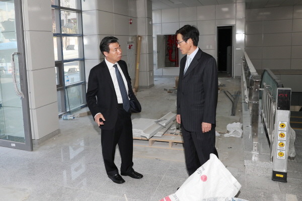 | ▲ 사진설명=박문수 서울 강북구의장(사진 왼쪽)이 우이-신설 경전철 역사 마무리 공사현장을 방문, 대리석으로 시공한 역사 바닥을 살펴보고 있다. | ||
