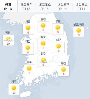 오전 서울은 6도, 춘천 1도, 대전 6도, 대구 6도, 부산 9도, 제주도 13도다. 어제보다 낮은 기온이다.