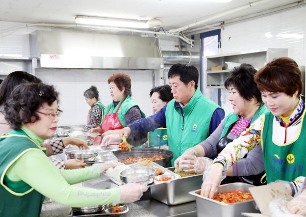 정찬민 경기 용인시장(가운데)은 지난 12일 처인구 마평동 새마을회관에서 새마을부녀회 회원과 풍덕천1동 부녀회원 등이 참석한 가운데 열린 ‘무료급식 배식봉사활동’에 참여해 지역내 홀몸노인과 노숙자들에 대한 배식봉사를 실시했다.(사진제공=용인시청)