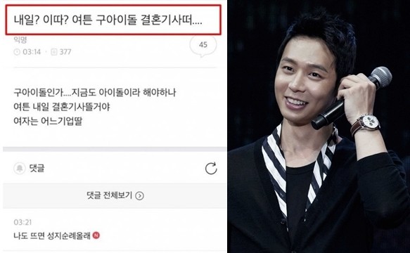 해당 글은 13일 새벽에 작성된 글로 “내일? 이따? 구아이돌 결혼 기사 떠”라며 “여자는 어느 기업 딸”이라고 적혀 있었으나 누구인지는 밝히지 않았다.