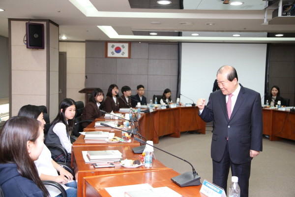 지난 13일 오후 박홍섭 서울 마포구청장(오른쪽)이 구청 9층 중회의실에서 열린 '마포구 청소년참여위원회 위원 위촉식'에 참석해 학생들에게 파이팅을 외치고 있다.(사진제공=마포구청)