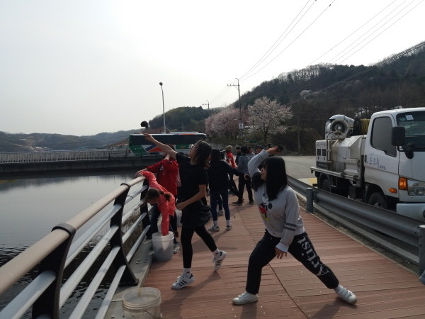 경기 동두천시는 지난 13일 EM센터에서 보산초등학교 6학년 학생들을 대상으로 Green동두천 환경교실을 개최했다. 사진은 학생들이 직접 만든 EM흙공을 신천에 던지고 있는 모습.(사진제공=동두천시청)