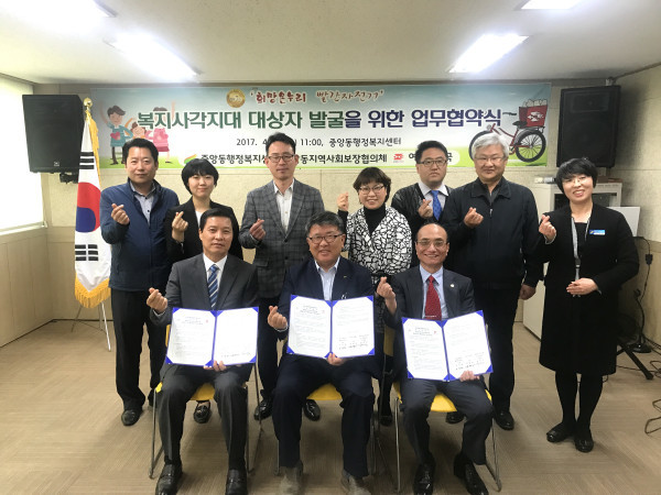 경기 여주시 중앙동 지역사회보장협의체는 최근 중앙동행정복지센터 및 여주우체국과 복지사각지대 대상자 발굴을 위한 ‘희망온누리 빨간자전거 업무협약’을 체결했다. 사진은 관계자들이 협무협약 체결후 기념촬영을 하는 모습.(사진제공=여주시청)