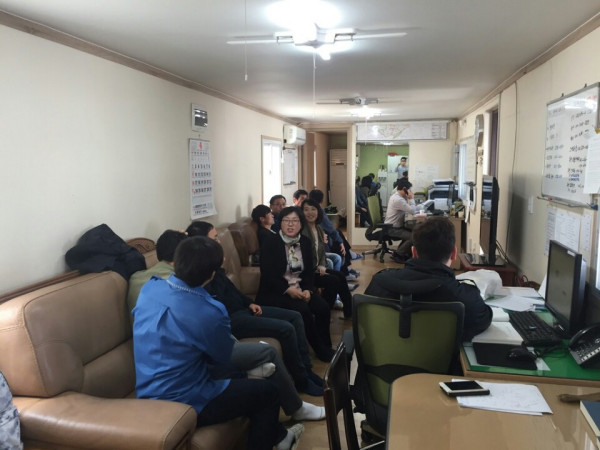 최근 경기 수원시 영통구 민방위팀장과 담당자는 불법주정차 단속업무를 수행중인 사회복무요원과 소통하기 위한 '작은 간담회'를 개최했다. 사진은 구 차량방치보관소를 방문한 관계자들이 사회복무요원과 이야기를 나누는 모습.(사진제공=영통구청)