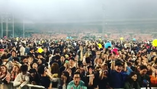 영상 속에는 많은 팬들이 무대 앞쪽까지 몰려와 즐거운 얼굴로 노래를 부르고 있다.
