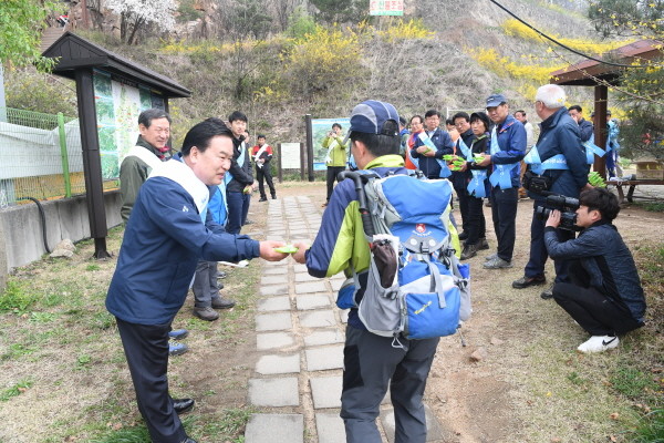 경기 양주시 퇴직 공직자들의 모임인 양주시 지방행정동우회 회원 50여명이 지난 15일 불곡산에서 ‘산불예방을 위한 캠페인’활동을 전개했다. 사진은 이성호 시장(왼쪽) 및 행정동우회 회원들이 등산객에게 산불예방을 당부하는 모습.(사진제공=양주시청)