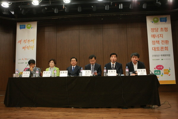 이해식 서울 강동구청장(오른쪽 두 번째)이 지난 14일 명동 은행회관 국제회의장에서 열린 에너지정책 전환 대토론회 ‘새 정부에 바란다’에 에너지 분야 전문가 패널로 참여해 강동구 사례를 바탕으로 지역 에너지 전환 활동과 정책 제언을 밝혔다.(사진제공=강동구청)