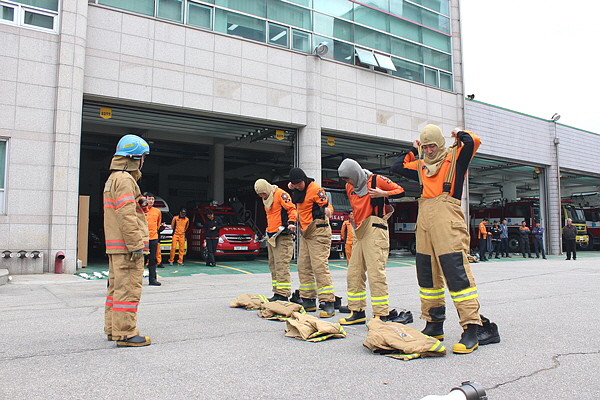 지난 14일 경기 포천소방서는 소방서 차고 앞에서 지역내 7곳의 119안전센터 화재진압대원이 참가한 가운데 ‘자체 소방기술경연대회’를 개최했다. 사진은 경연대회에 참가한 소방관들이 보호복 착용을 하고 있는 모습.(사진제공=포천소방서)