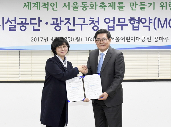 지난 17일 광진구와 서울시설공단이 서울동화축제의 안정적인 추진과 어린이대공원 활성화를 위한 협력을 다지기 위해 업무협약을 체결했다. 사진은 김기동 구청장(오른쪽)과 이지윤 서울시설공단 이사장이 악수하는 모습.(사진제공=광진구청)