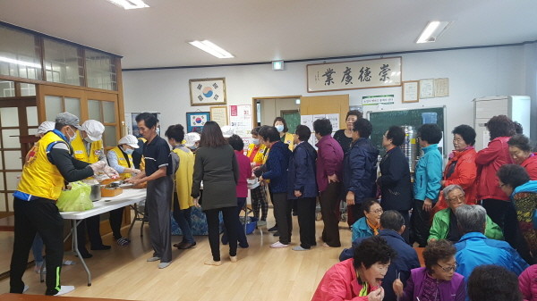 대한적십자남면봉사회와 양주시사회복지협의회는 지난 17일 대한노인회남면분회에서 저소득 노인 50여명을 대상으로 '사랑의 경로식당 무료급식 봉사활동'을 실시했다. 사진은 노인들이 음식을 받고 있는 모습.(사진제공=양주시청)