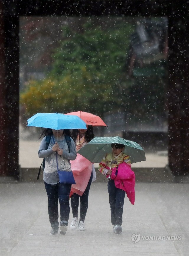 18일 오후 서울 종로구 창덕궁을 찾은 관람객이 갑자기 쏟아지는 비에 우산을 쓴 채 이동하고 있다.