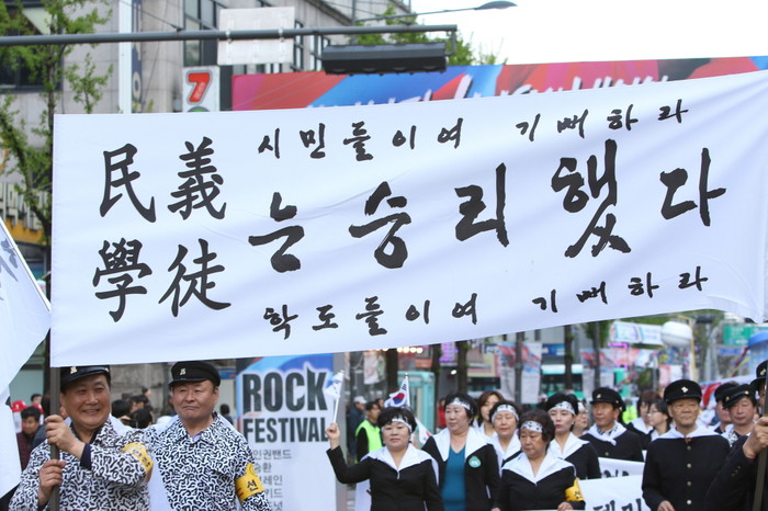지난 18일 서울 강북구 '4.19혁명 국민문화제 2017' 전야제 행사에서 '1960년대 거리재현 퍼레이드'가 펼쳐진 가운데 행사 참가자들이 '民義(민의)는 승리했다'는 플랜카드를 들고 거리행진을 펼치고 있다. (사진제공=강북구청)