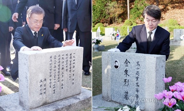 더불어민주당 문재인 대선후보(왼쪽사진)와 국민의당 안철수 대선 후보가 각각 19일 오전 서울 강북구 국립 4.19 민주묘지에서 참배하고 김주열 열사 묘를 찾고 있다.