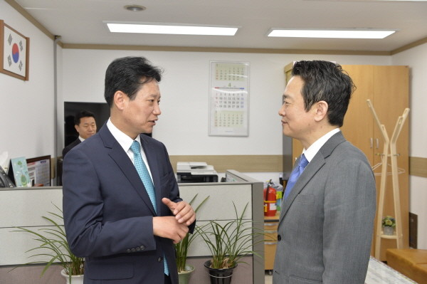 김종천 경기 포천시장은 지난 17일 경기도청을 방문해 남경필 경기도지사와 이재율 행정1부지사 등 관계자들과 함께 지역 현안에 대해 논의했다. 사진은 남 지사(오른쪽)와 김 시장이 현안 논의 후 이야기를 나누고 있는 모습.(사진제공=포천시청)