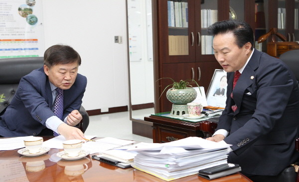 지난 19일 조동탁 강동구의회 의장(사진 오른쪽)이 구의회를 방문한 황평연 서울지방병무청장을 만나 병무청의 올해 주요 역점사업에 대한 설명을 듣고 양기관의 협업방안에 대해 논의하고 있다.(사진제공=강동구의회)