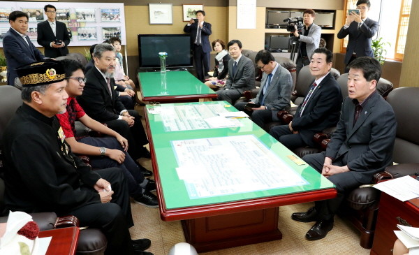 | ▲ 사진설명=제갈원영 인천시의장이 지난 19일 인천시의회를 방문한 무하마드 아체주 왕 일행단을 만나 상호 친선교류 방안에 대해 의견을 나누고 있다. | ||