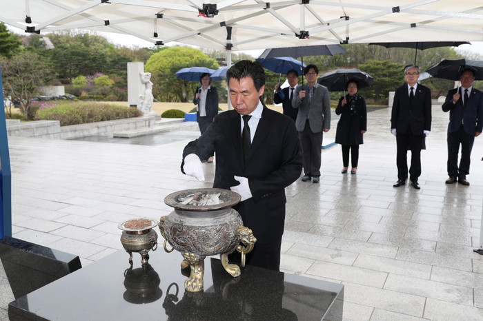서울 강북구의회 박문수 의장 등 의원들이 4.19혁명 57주년을 맞아 우이동에 위치한 국립 4.19 민주묘지를 방문한 가운데 박 의장이 4.19혁명의 숭고한 이념을 되새기고 민주주의를 위해 희생한 민주 영령들의 넋을 추모하고 있다. (사진제공=강북구의회)