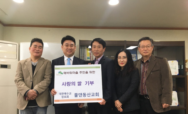 최근 서울 은평구 응암2동 주민센터가 물댄동산교회로부터 지역내 어려운 이웃을 위한 사랑의 쌀(300kg)을 기부 받았다. 사진은 사랑의 쌀을 기부한 교회 관계자와 동주민센터 관계자들이 기념촬영을 하고 있는 모습.(사진제공=은평구청)