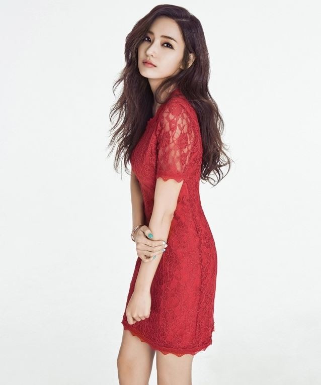 한채영은 붉은 컬러의 레이스 원피스를 걸친고 섹시한 웨이브 헤어를 한채 카메라를 물끄러미 바라보고 있다.