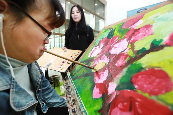 지난 20일 제37회 장애인의 날을 맞아 서울 송파구 삼전동 송파구민회관에서 열린 장애인 그림동호회 '화사랑' 그림 전시회가 개최됐다. 사진은 전시회에서 이현정 작가가 붓을 입에 물고 그림을 그리고 있는 모습.(사진제공=송파구청)