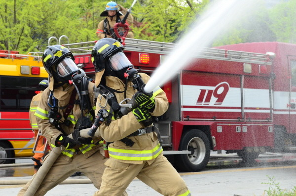 서울 영등포소방서는 지난 20일 오전 여의도동 KDB산업은행 건물에서 외국소방대 7개국이 참여한 가운데 ‘2017년 국제합동 긴급구조종합훈련’를 실시했다. 사진은 소방공무원들이 소방호스를 이용해 화재진압훈련을 하는 모습.(사진제공=영등포소방서)