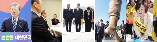 더불어민주당 문재인 대선후보가 23일 오전 국회 헌정기념관에서 한반도 비핵평화구상 기자회견을 하고 있다(왼쪽부터). 자유한국당 홍준표 대선후보가 23일 오전 서울 여의도 메리어트호텔에서 국가 원로를 예방하고 얘기를 나누고 있다. 국민의당 안철수 대선후보가 22일 오후 경남 김해시 진영읍 본산리 봉하마을 고(故) 노무현 전 대통령 묘역을 찾아 참배하고 있다. 바른정당 유승민 대선후보가 23일 오전 경기도 파주시 임진각을 찾아 '평화의 발'을 만져보며 살펴보고 있다. 정의당 심상정 대선후보가 23일 오전 서울 은평구 북한산 등산로 입구를 찾아 유세를 하기 전 시민119산악구조대원으로 부터 심폐소생술을 배우고 있다.