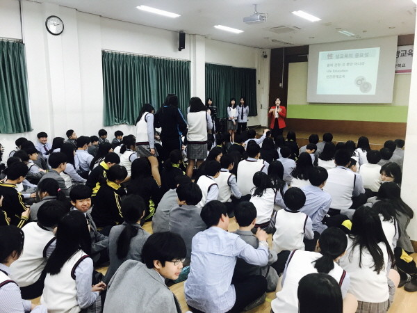 경기 수원시 영통구는 최근 원천중학교 소강당에서 찾아가는 청소년 성폭력 예방 교육을 실시했다. 사진은 한국지역사회교육협의회 소속 성교육 전문 강사가 학생들에게 강연하는 모습.(사진제공=영통구청)
