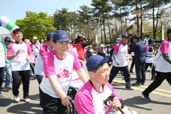 지난 22일 오후 마포구 상암동 월드컵경기장 평화광장에서 열린 장애인과 비장애인이 함께 참여하는 '제8회 마포 거북이 마라톤' 행사에 참여한 박홍섭 구청장이 한 장애인의 휠체어를 밀며 걷고 있다.(사진제공=마포구청)