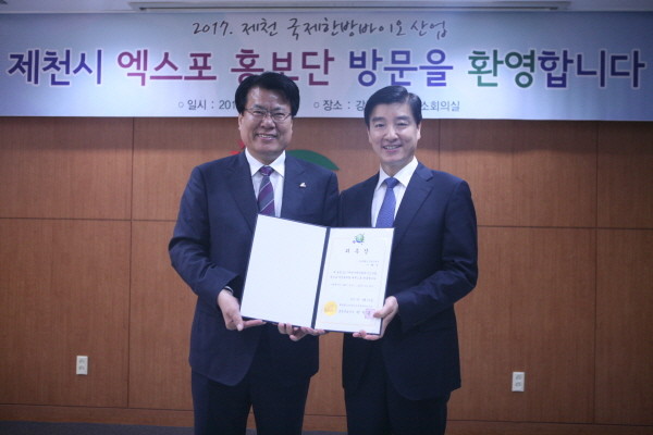 이해식 강동구청장은 지난 21일 오전 9시30분 구청 소회의실에서 '2017 제천 국제한방바이오산업엑스포 홍보단 방문' 환영식을 개최했다. 사진은 이 구청장(오른쪽)과 이근규 제천시장이 기념촬영을 하는 모습.(사진제공=강동구청)