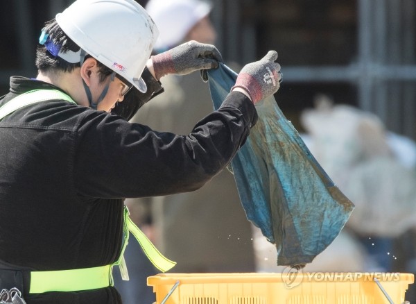 | ▲ 24일 오전 전남 목포신항만에 거치된 세월호 앞에 마련된 펄 세척장에서 현장수습본부 관계자가 펄 세척기를 통해 나온 옷을 들어보이고 있다.(사진제공=연합뉴스) | ||