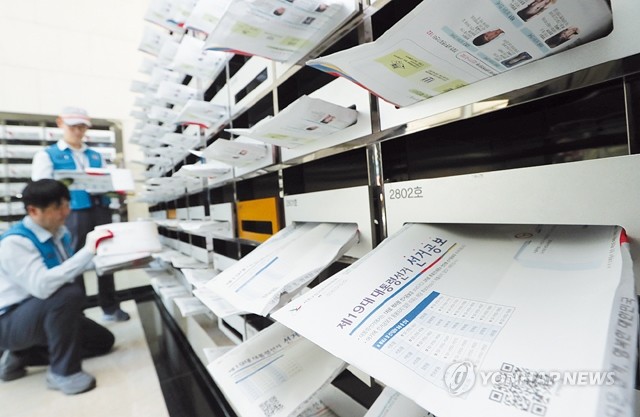 제19대 대통령선거를 보름 앞둔 24일 오후 서울 서초구의 한 오피스텔에서 집배원들이 책자형 선거공보물을 유권자 가정의 우편함에 넣고 있다.