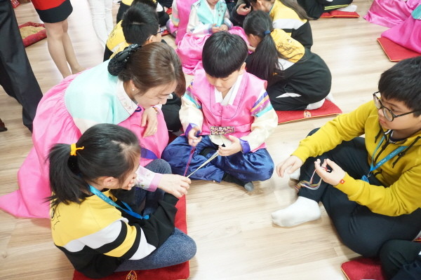 최근 홍콩 위례성 침례교 은평소학교 학생 및 교직원 45명이 경기 부천시 솔안초등학교를 방문해 홍콩과 한국학교 간 초등교육 문화 교류의 장을 펼쳤다. 사진은 한국 학생들과 홍콩 학생들이 '장명루' 만들기 체험을 하는 모습.(사진제공=부천교육지원청)