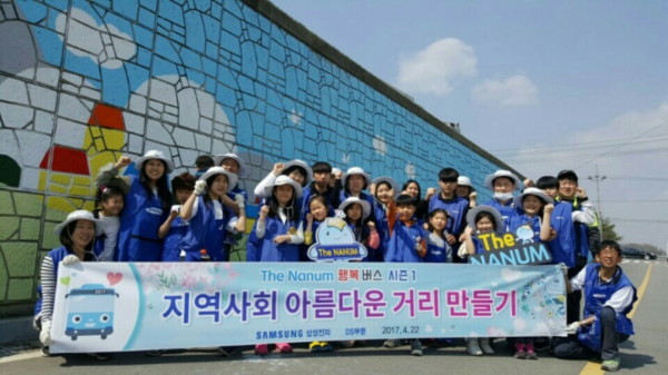 삼성전자 자원봉사팀인 '더 나눔(The NANUM)'은 지난 22일 경기 평택시 원평동 환경 취약지인 평남로 일대에서 벽화그리기 활동인 '지역사회 아름다운 거리 만들기' 봉사활동을 실시했다. 사진은 봉사활동 종료 후 관계자들이 기념촬영을 하는 모습.(사진제공=평택시청)