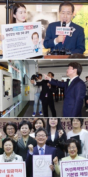 자유한국당 홍준표 대선후보가 25일 오전 서울 서대문구 씨티비지니스센터에서 열린 ‘청년 창업자 간담회’에서 청년창업 관련 공약을 발표하고 있다(위부터). 국민의당 안철수 대선후보가 지난 24일 오후 전남 나주혁신도시 한전 KDN을 방문 홍보관을 둘러보고 있다. 바른정당 유승민 후보가 25일 오전 서울 용산구 한국여성단체협의회에서 열린 제19대 대통령 후보 초청 성평등정책 간담회를 마친 뒤 기념촬영을 하고 있다.