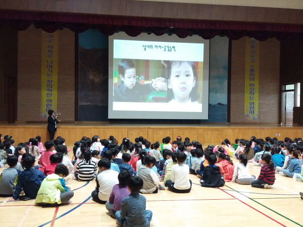 경기 수원시 권선구는 지난 25일 수원중촌초등학교 강당에서 1,2,3학년 전체 379명을 대상으로 성평등 의식교육을 실시했다. 사진은 ‘남녀의 차이-공감 능력’에 대한 교육이 진행 중인 모습.(사진제공=권선구청)