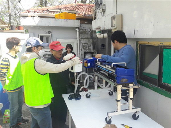 도봉구 쌍문1동의 높은뜻정의교회 소속 ‘집수리 봉사단’이 지난 22일 무허가 건물에 거주하고 있는 지역내 저소득 취약계층 가구를 방문해 집수리 자원봉사를 실시했다. 사진은 참여자들이 집수리를 하는 모습.(사진제공=도봉구청)