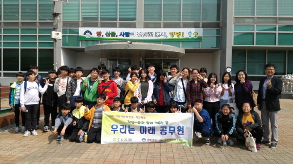 경기 양평군 용문면에 위치한 용문중학교 1학년 학생 60여명은 지난 25일 평생학습센터에서 ‘공무원의 역할 및 공무원이 되기 위한 방법’이란 주제의 강의를 들은 후 군청으로 이동해 공무원 업무를 경험하는 체험활동을 실시했다. 사진은 학생들이 기념촬영을 하는 모습.(사진설명=양평군청)