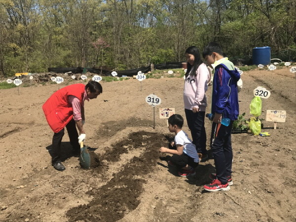 최근 도봉구는 정의공주주말농장에서 드림스타트 아동 및 가족 등이 참여한 가운데 ‘도봉 드림가족농장’ 개장식을 개최했다. 사진은 주말농장 운영에 참가한 한 가족이 농작물을 심고 있는 모습.(사진제공=도봉구청)