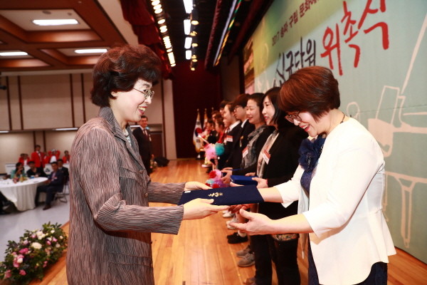 박춘희 서울 송파구청장이(왼쪽) 지난 26일 구청 대강당에서 개최된 ‘송파구립문화예술·체육단체 신규단원 위촉식’에 참석해 위촉장을 수여하고 인사말을 전했다.(사진제공=송파구청)