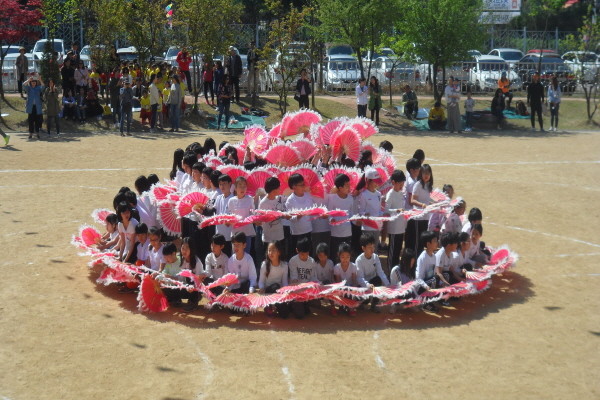경기 부천시 성곡초등학교는 지난 26일 1~6학년 학생과 병설유치원생, 학부모가 한자리에 모여 ‘한마음 체육대회’를 실시했다. 사진은 학생들이 부채춤 무용을 선보이는 모습.(사진제공=부천교육지원청)