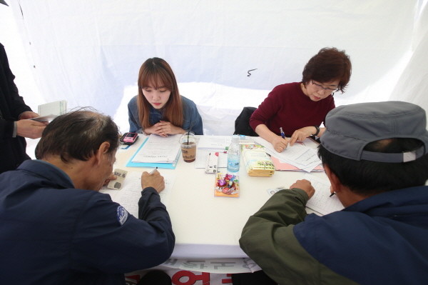 서울 성북구가 최근 구청 앞 바람마당에서 ‘2017 찾아가는 취업박람회’를 개최했다. 사진은 기업채용관 부스에서 현장 면접을 진행하는 기업 인사담당자와 구직자의 모습.(사진제공=성북구청)